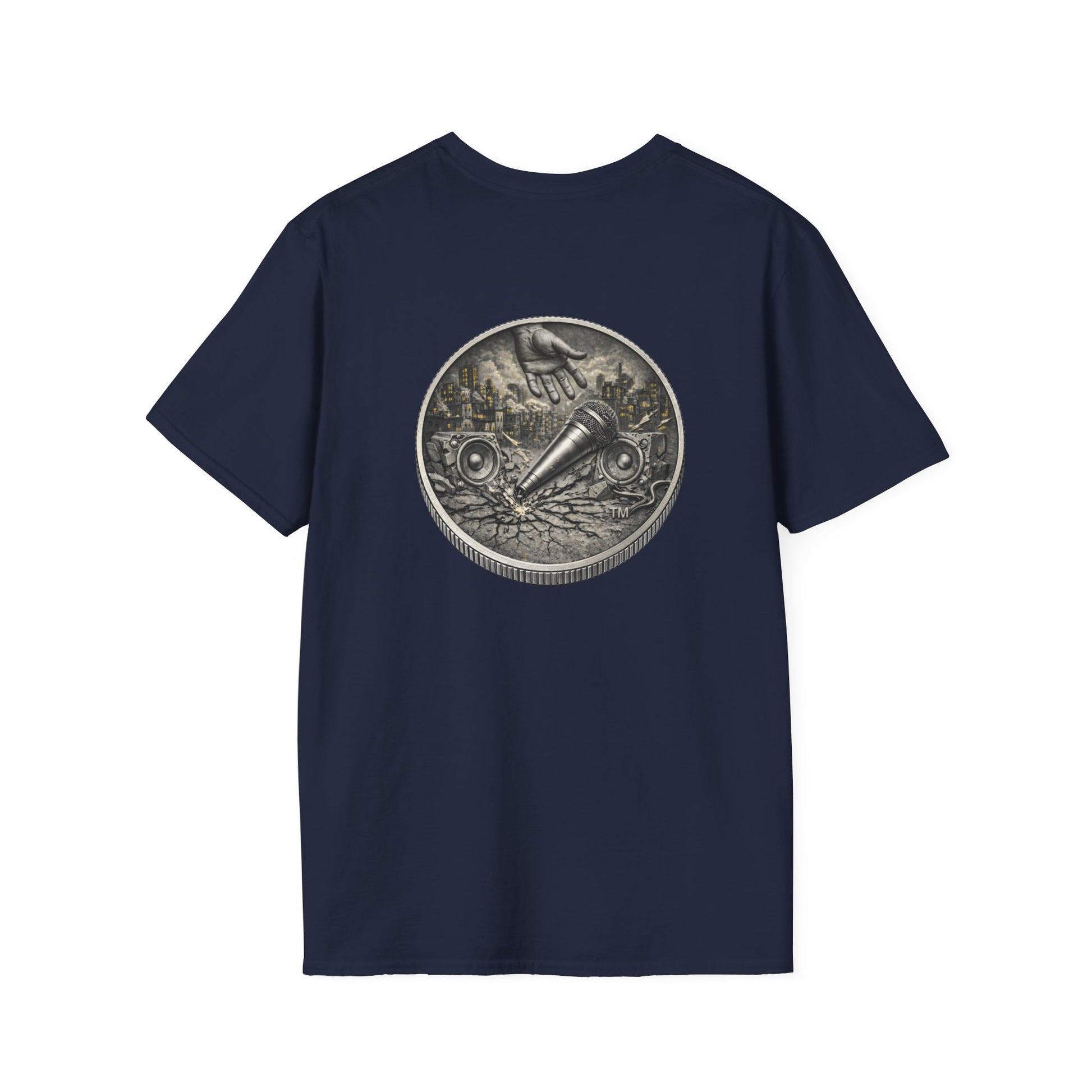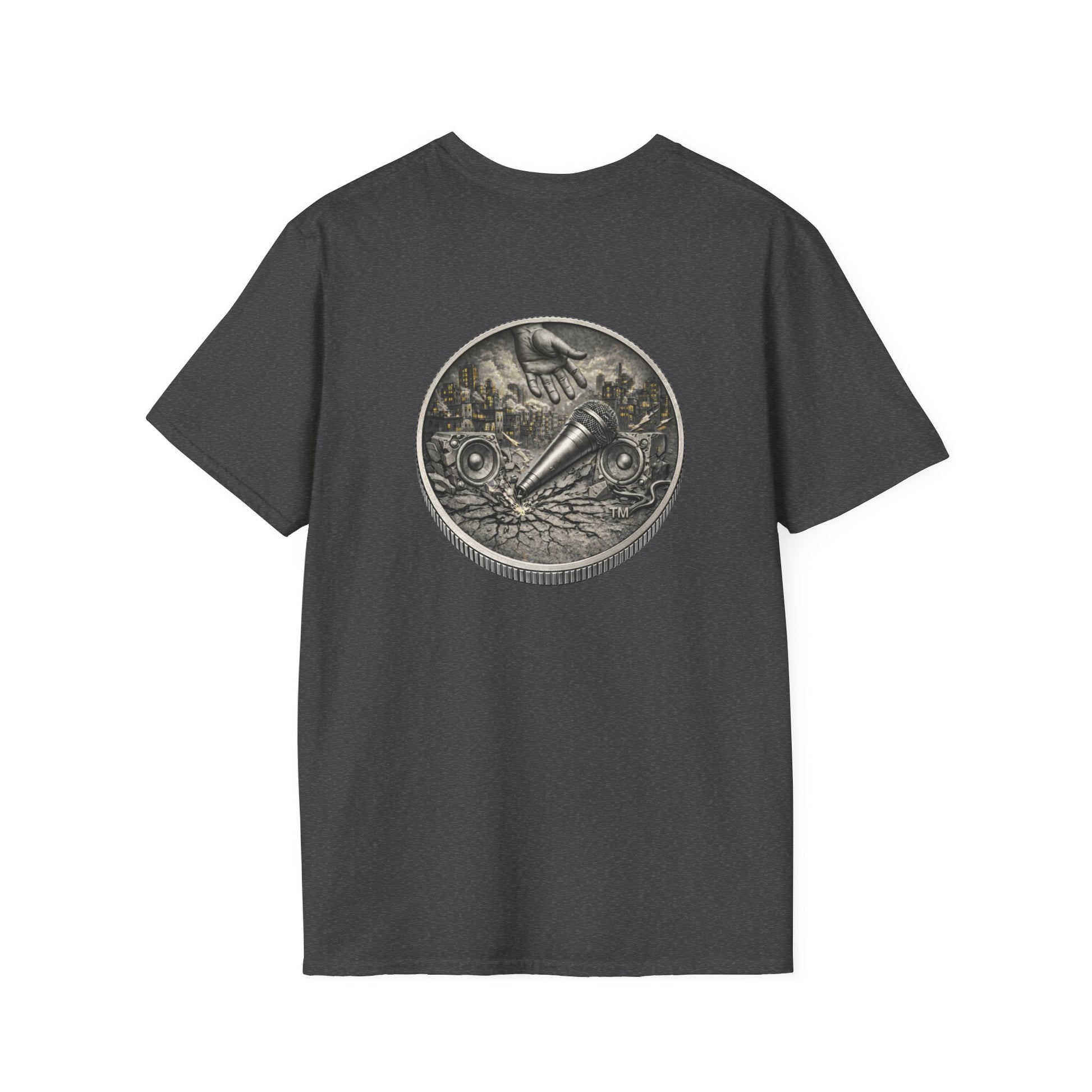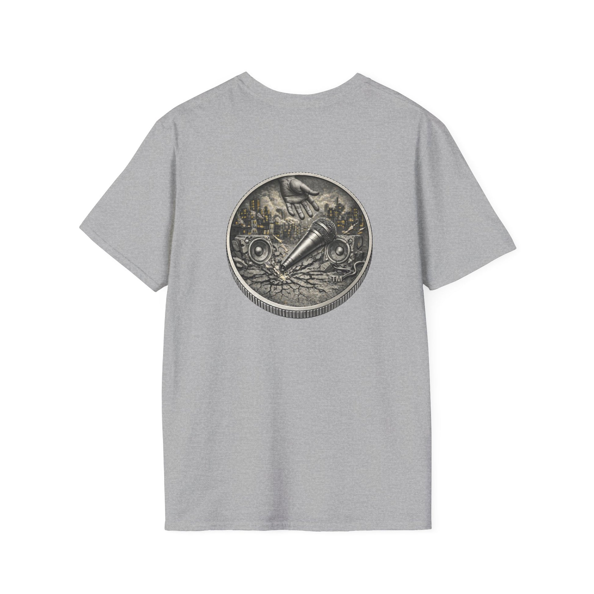 This lightweight cotton tee carries a quiet, vintage confidence. The front features a coin-like medallion with a weathered portrait; the back mirrors the motif with an engraved-style emblem and subtle script. Worn by someone who likes history, vinyl records, and late-night conversations, it slips easily under a leather jacket or pairs with worn denim. The shirt feels lived-in but clean — the soft ring-spun cotton sits close to the body without clinging, while the ribbed collar and shoulder tape keep the fit balanced. It’s the kind of shirt you reach for when you want an understated statement: nostalgic, tactile, and a little bit soulful.